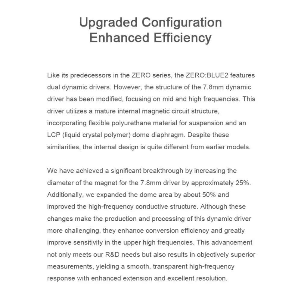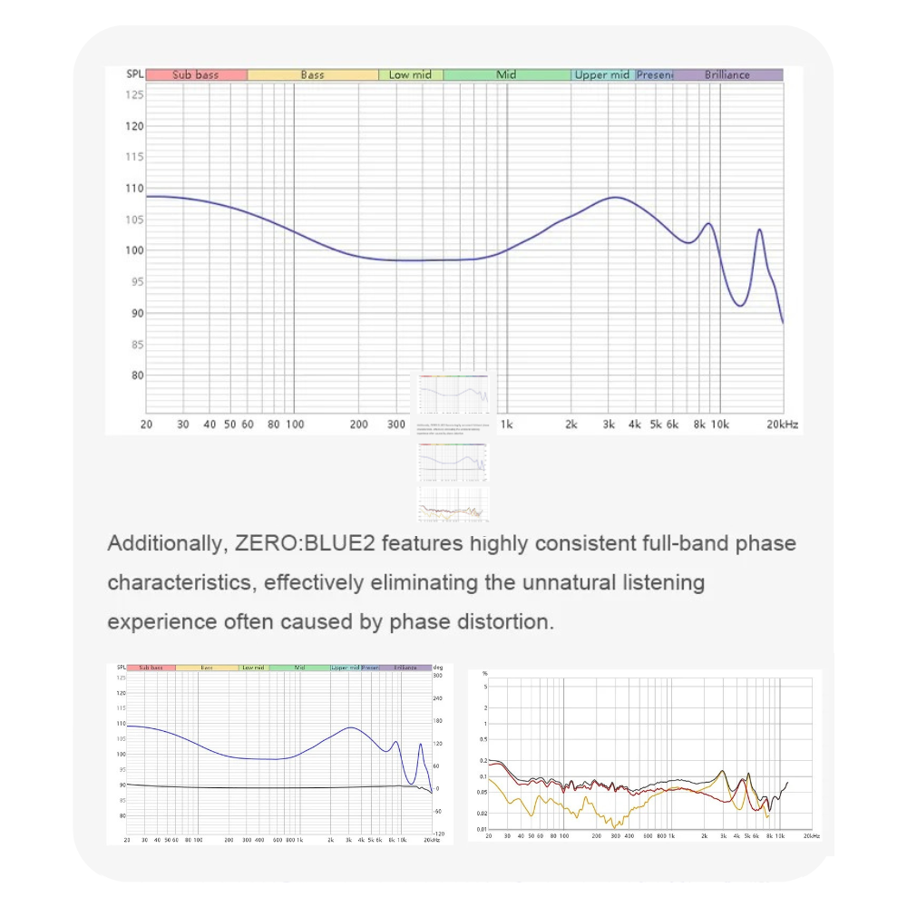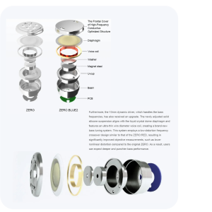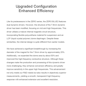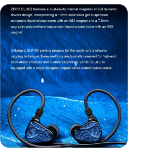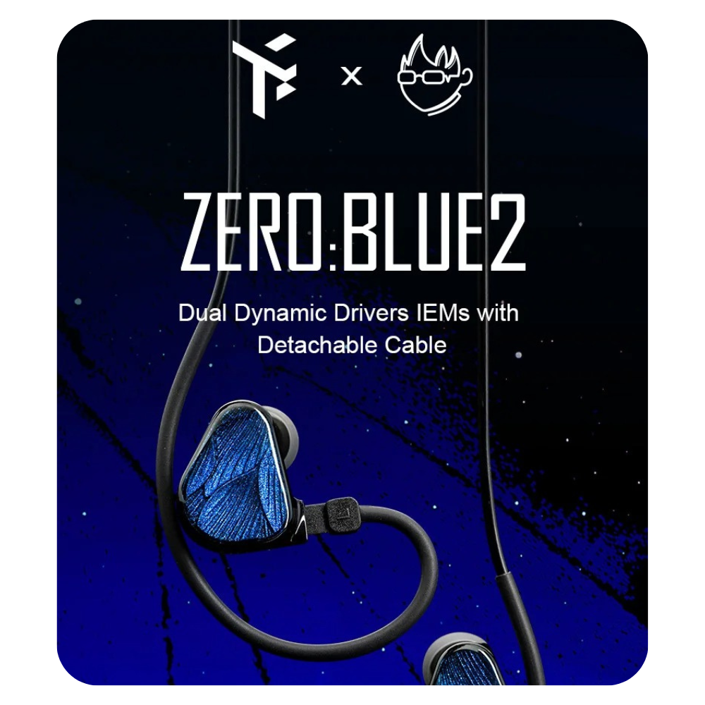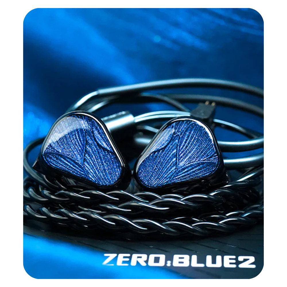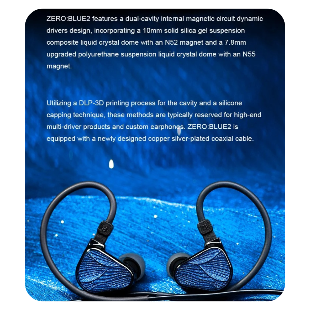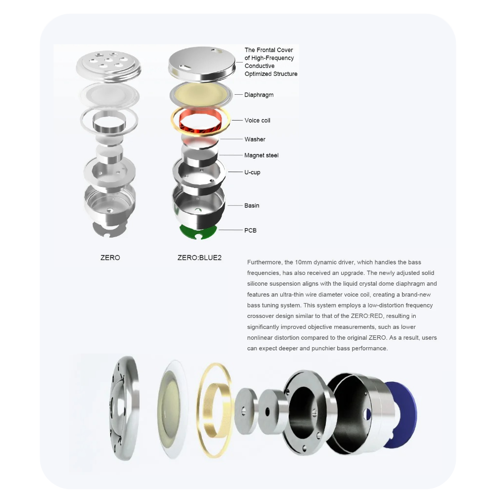 TruthEar x Crinacle Zero: Blue 2 uses dual dynamic drivers — 10mm LCP diaphragm for bass + 7.8mm PU diaphragm for mids/highs — tuned for deep lows, clean mids, and smooth treble.